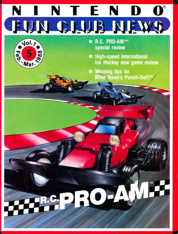 Nintendo Fun Club News Vol. 1, Issue 5, Feb-Mar 1988 - Fun fact, R.C. Pro-Am is the first Nintendo-published, but not developed game to get its own Fun Club News cover.