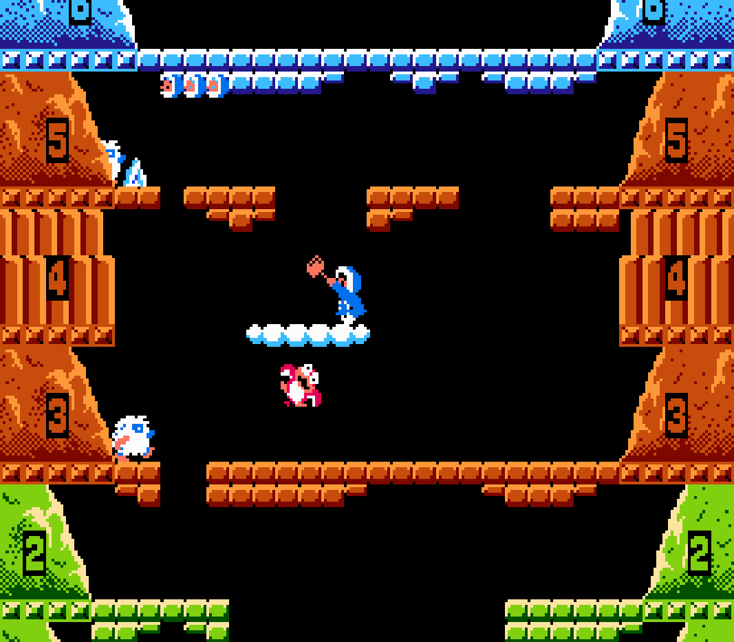 Popo and Nana are armed with hammers and oversized gender-announcing parkas. Separately or together, they scale through layers of ancient rock, smash obnoxious birds (Nitpickers) and adorable small yetis (Topis), and try not to fall back down the mountain. In addition to the mountain itself, clouds serve as platforms and either move languidly across the screen or fly past like they're on a time-sensitive mission from God. Either way, you'll need to jump between the rocky ground and the clouds to reach the summit.