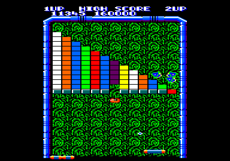 Some blocks, once hit, release colored pellets that give Vaus extra powers. The colors dictate Vaus’ new abilities, so dark blue extends the ship’s length, while red gives Vaus the ability to shoot lasers and destroy the bricks on his own, orange slows the energy ball down, etc.