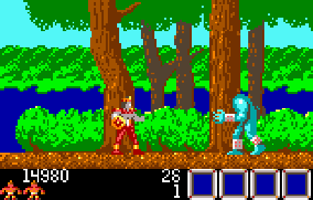 Rygar’s a man’s man. He’s beefed to the nines, muscles on muscles, filled with stamina, vigor, and determination. His weapon is a Diskarmor, a shield with a chain that returns to him when he pulls on it. He was dead once, but now he’s back to slay evil again, restore peace to the land of Argool. Is Argool Rygar’s home? Does it matter? The man willingly came back from the dead, against all odds. His motives might be his own, but as long as he’s on your side, all is well.