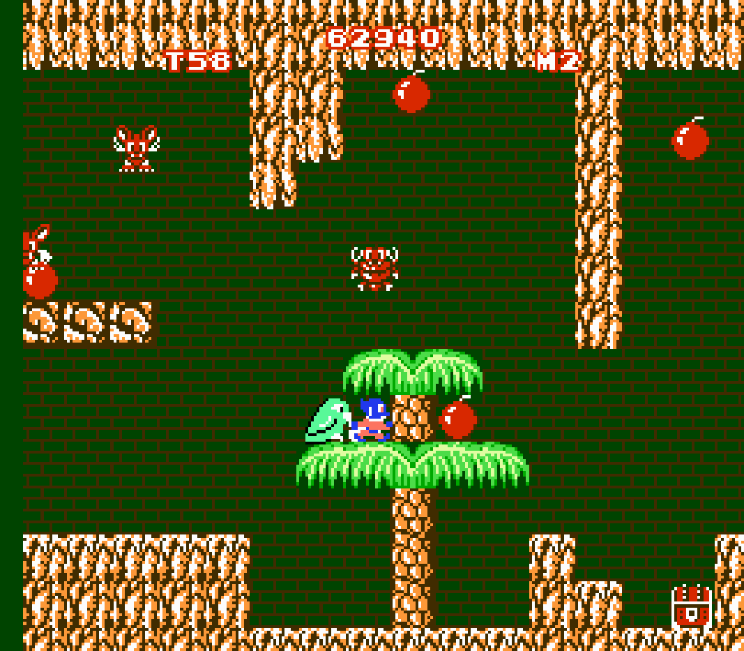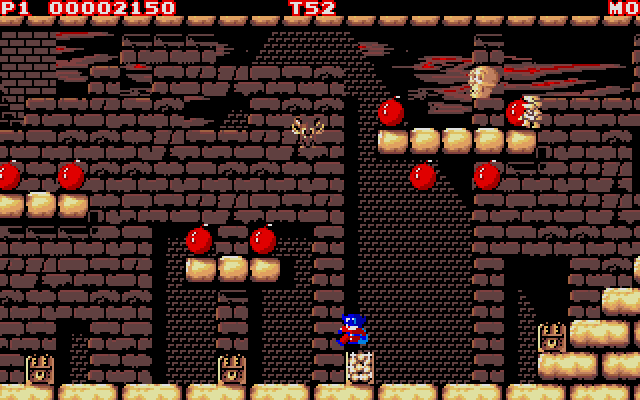 Jack’s stuck in a pyramid, sixteen levels worth. Each level contains a side-scrolling passageway, littered with bombs, treasure chests and enemies, and a single-screen Palace Room, where you must collect all the bombs to move to the next stage. Bombs give you points and are easily collected, while treasure chests uncover helpful items, but can only be opened when Jack uses Mighty Coins.