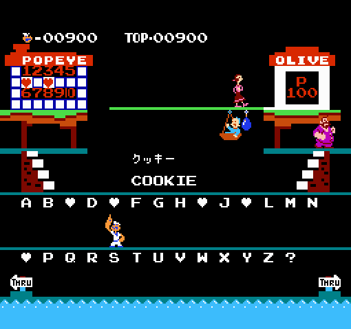 Popeye no Eigo Asobi (or “Popeye’s English Game”) is an absolutely adequate English lesson. As Popeye, you choose from one of six categories – Animals, Sports, Food, etc. Olive Oyl tosses hearts which form a word in katakana that Popeye then has to spell out in English. All 26 letters of the English alphabet* are at Popeye’s disposal, and naturally, he doesn’t just pick a letter – he uppercuts it, presumably with the power of spinach.