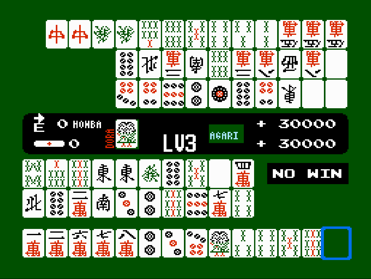 Mahjong is what you might expect, simple two-player riichi mahjong between you and the computer and the first in a sea of Famicom mahjong titles.