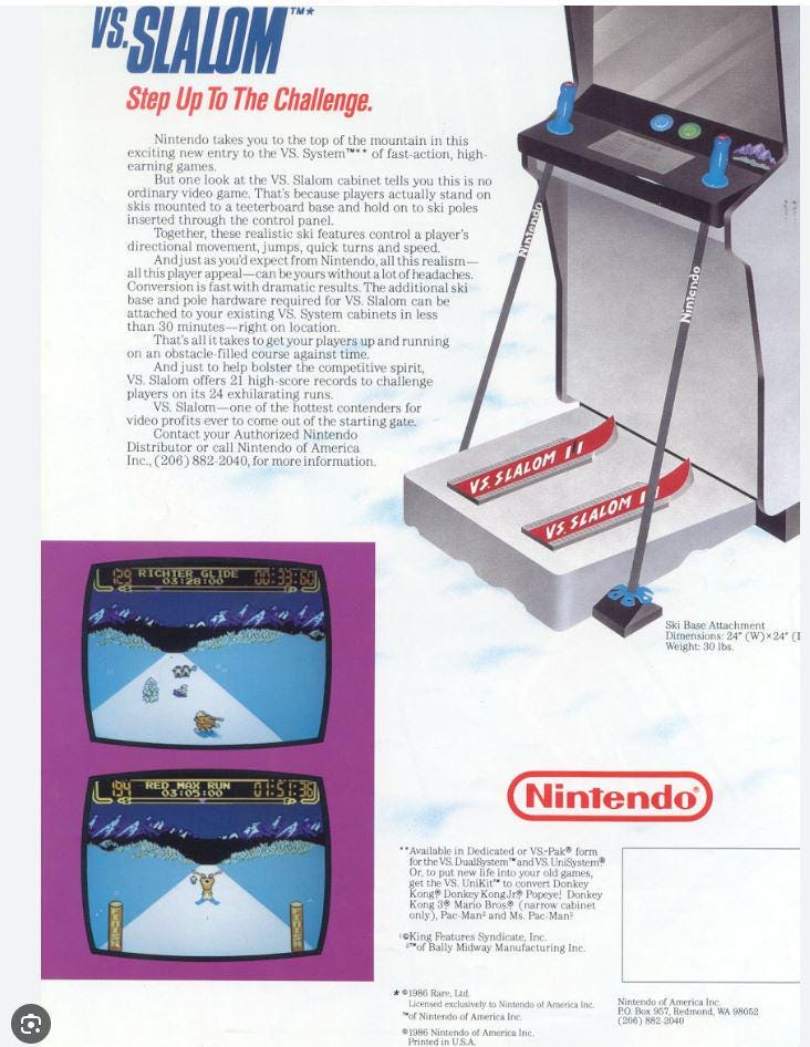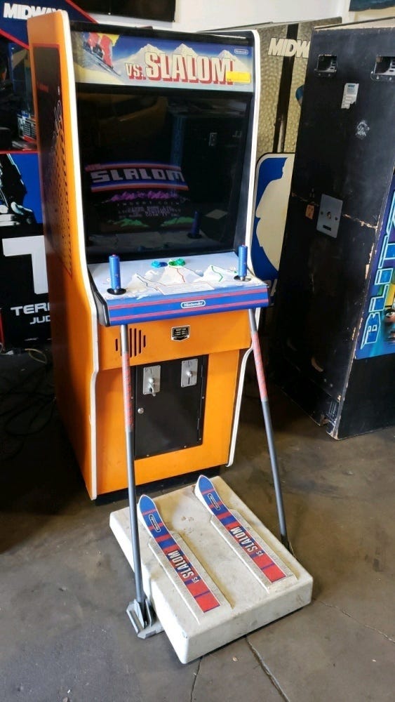Neither of these games mean much to me. But the Slalom arcade cabinet is a really cool find! I definitely never saw one. But I was always drawn to immersive cabinets. Now when I observe my son, I notice that he considers a cool cabinet the entire point of an arcade. If we're just going to stand up and play some game with a joystick, we might as well go home.